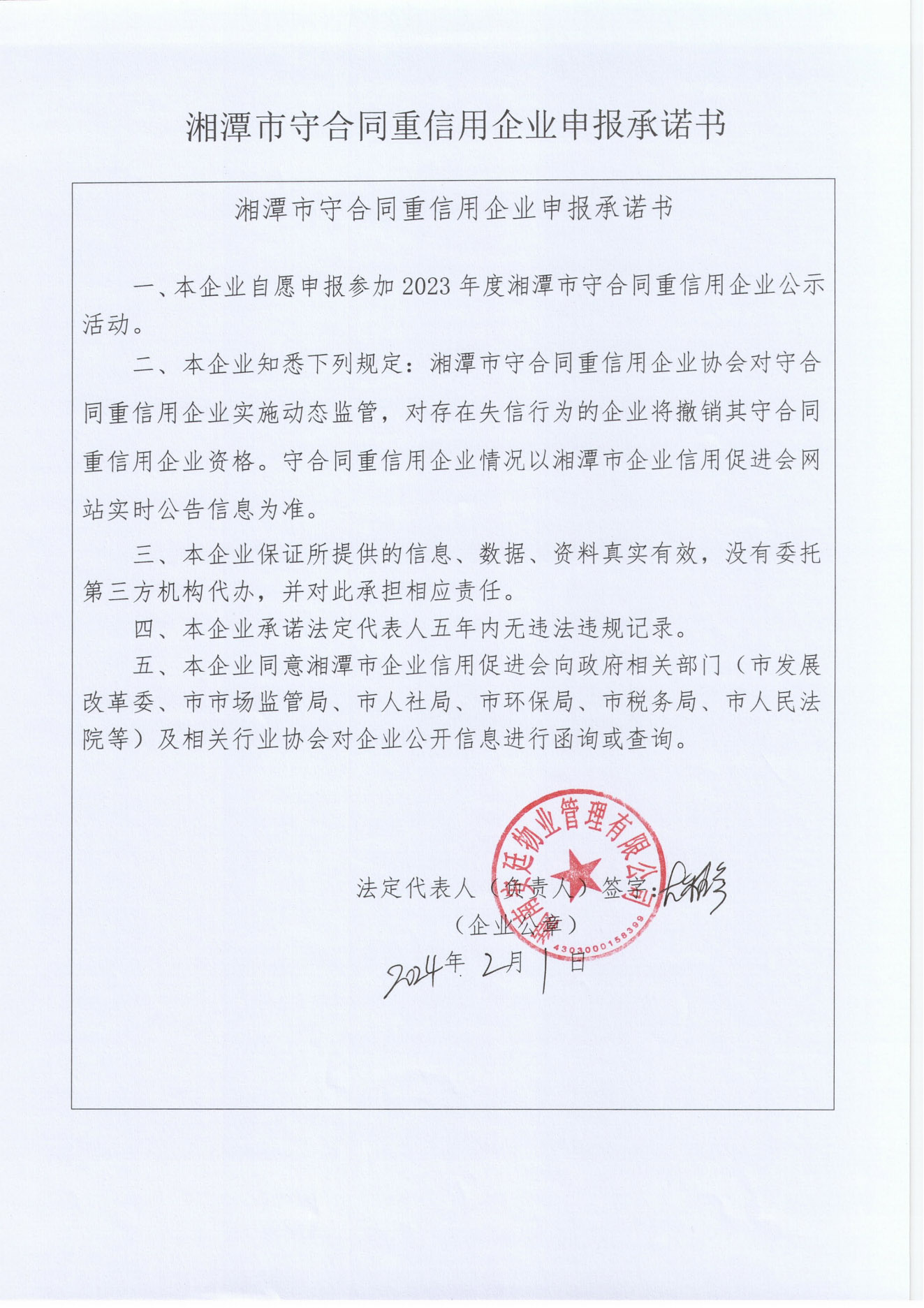本企業(yè)根據(jù)《湘潭市守合同重信用企業(yè)申報規(guī)定》等編制 2023 年度企業(yè)信用報告書,并保證本報告書內(nèi)容真實、準(zhǔn)確、完整。