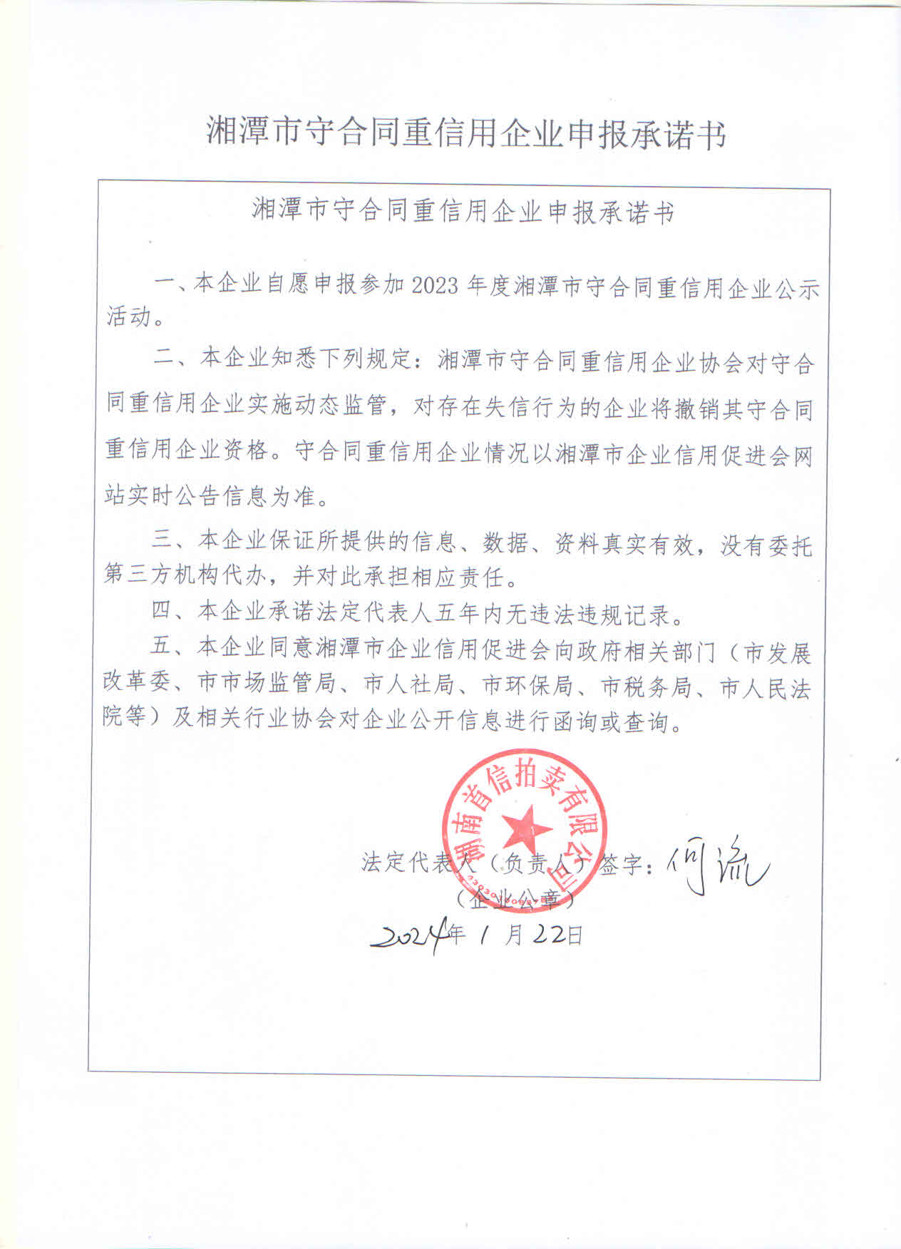 本企業(yè)根據(jù)《湘潭市守合同重信用企業(yè)申報(bào)規(guī)定》等編制 2023 年度企業(yè)信用報(bào)告書(shū),并保證本報(bào)告書(shū)內(nèi)容真實(shí)、準(zhǔn)確、完整。