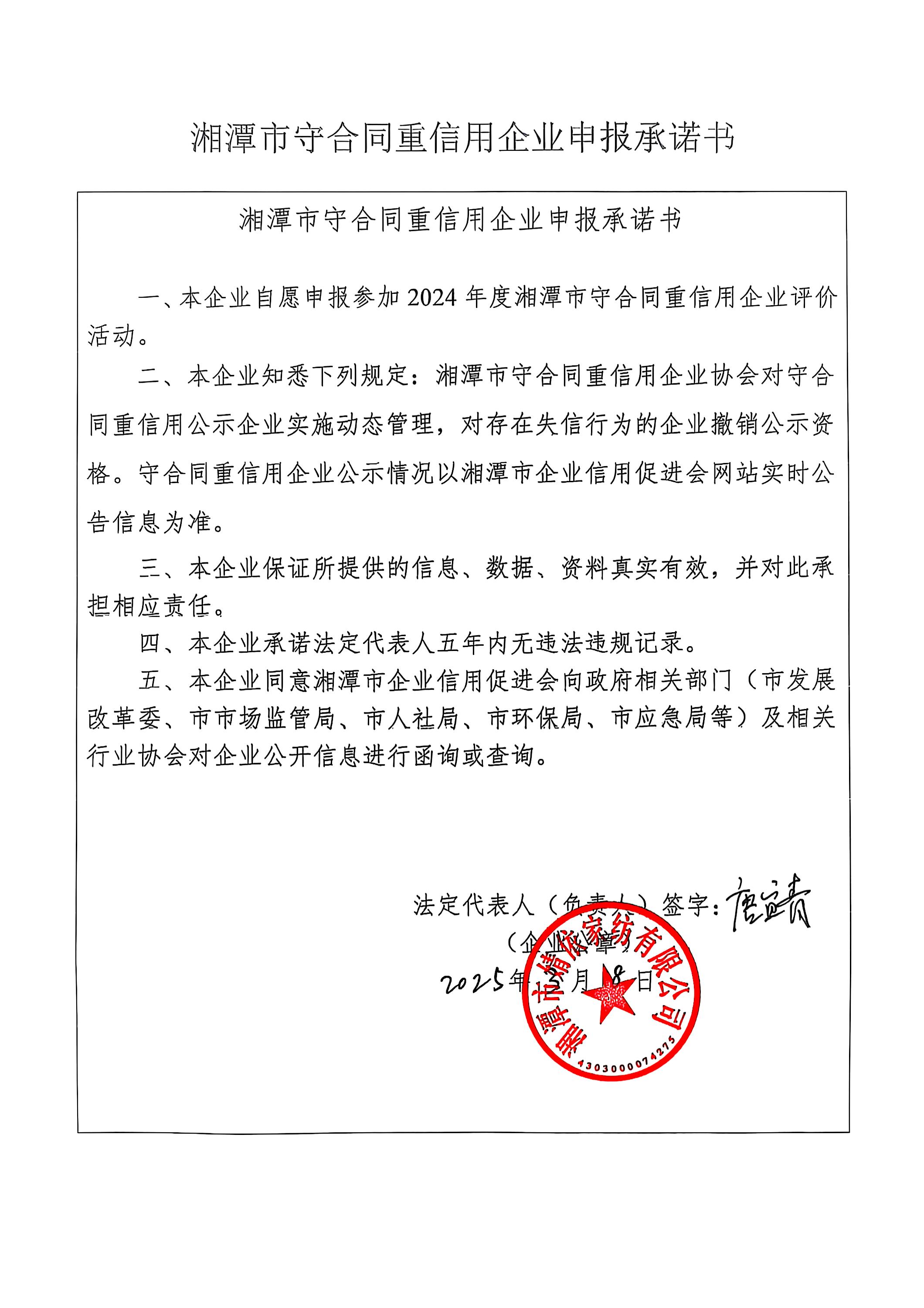 本企業(yè)根據(jù)《湘潭市守合同重信用企業(yè)申報(bào)規(guī)定》等編制 2024 年度企業(yè)信用報(bào)告書(shū),并保證本報(bào)告書(shū)內(nèi)容真實(shí)、準(zhǔn)確、完整。